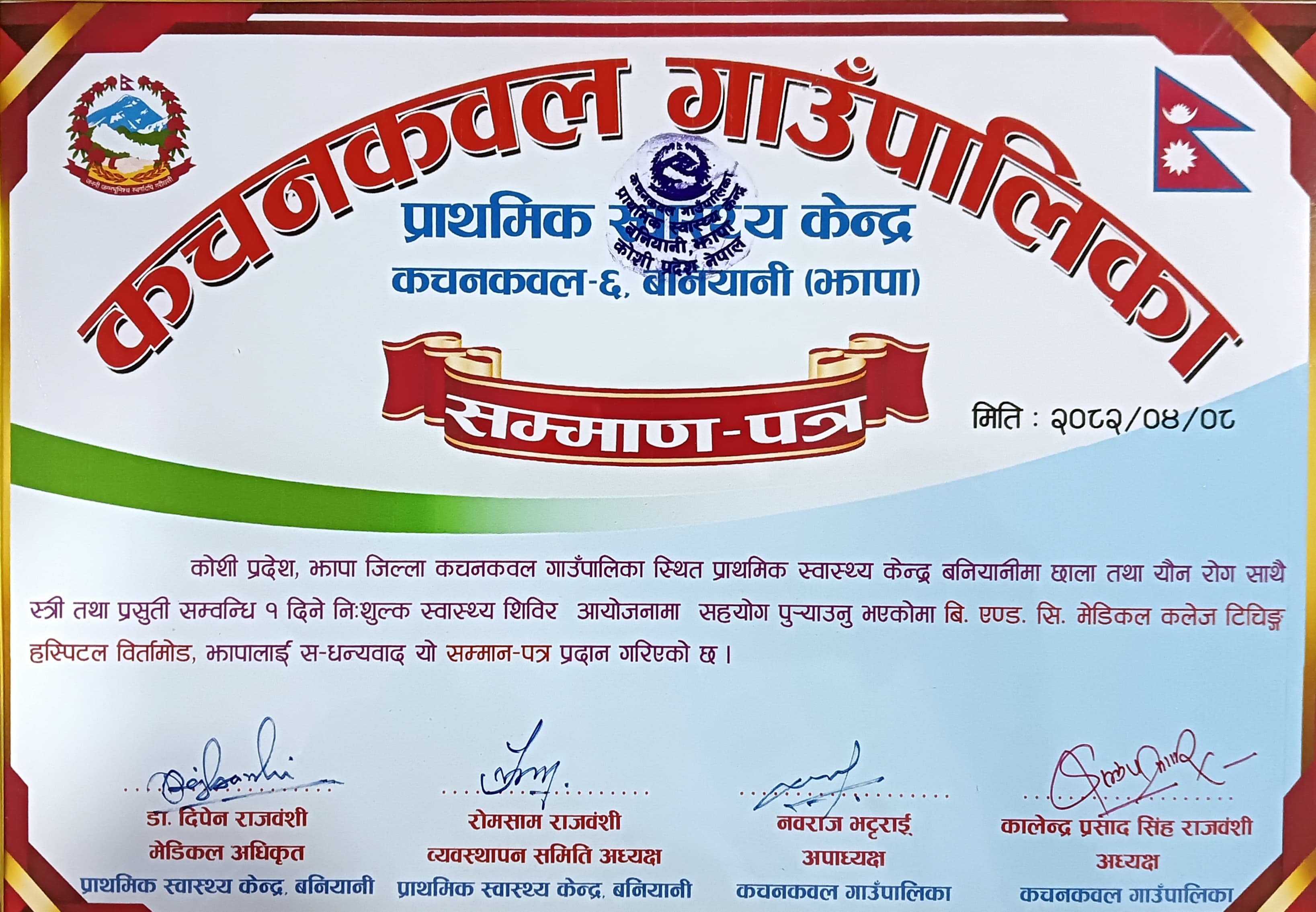 Certificate of Appreciation from Kachankawal Rural Municipality Primary Health Centre