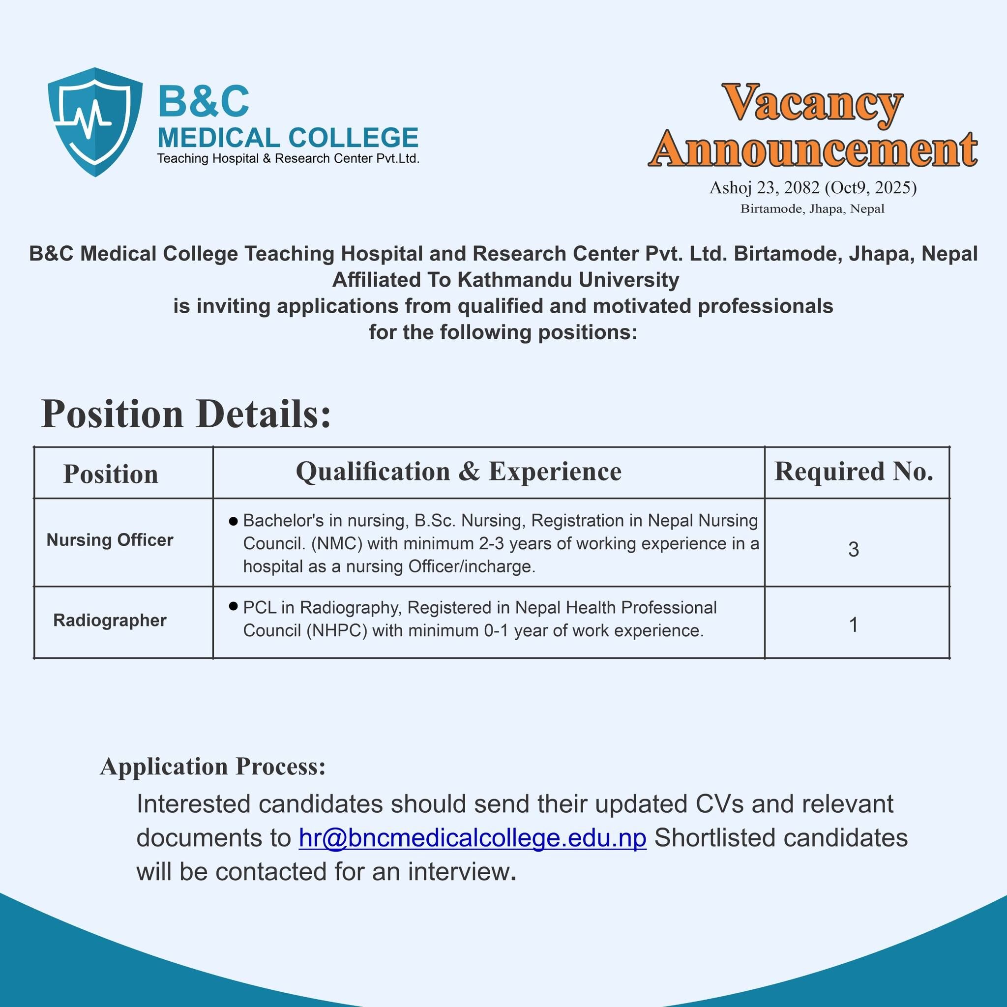 Interested candidate is encouraged to apply with their updated CV and other relevant documents at hr@bncmedicalcollege.edu.np