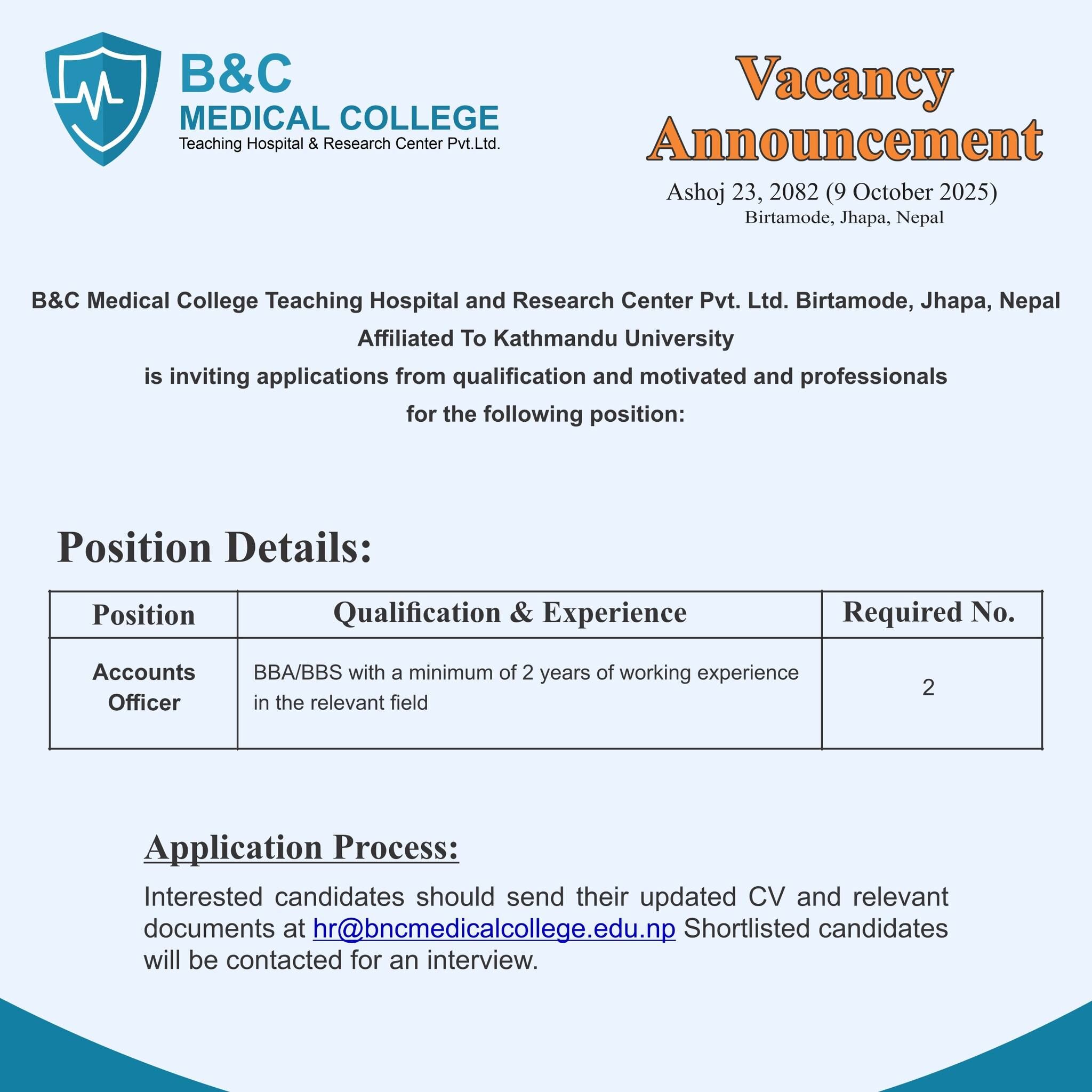 B&C Medical College Teaching Hospital and Research Center Pvt. Ltd., Birtamode, Jhapa, Nepal affiliated to Kathmandu University invites applications from eligible and highly motivated professional candidates for the following positions.